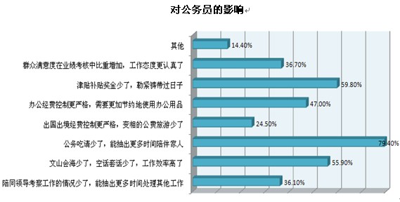 “八項(xiàng)規(guī)定”的執(zhí)行給公務(wù)員帶來的最大影響是什么?本次調(diào)查中,排名前三位的影響依次是“公務(wù)吃請少了,能抽出更多時(shí)間陪伴家人”(79.4%)、“津貼補(bǔ)貼獎金少了,勒緊褲帶過日子”(59.8%)和“文山會海少了,空話套話少了,工作效率高了”(55.9%)。