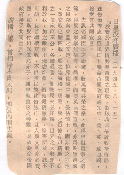 1945年8月15日日本天皇投降廣播詞。這篇文告是告訴自己的老百姓(忠良臣民)的。其中對(duì)于發(fā)動(dòng)戰(zhàn)爭(zhēng)的罪責(zé)不但沒有一個(gè)字的自責(zé),而且指“敵使用殘虐炸彈,頻頻殺傷無辜,慘害所及,誠不可測(cè)!焙褪嗄旰笏l(fā)現(xiàn)的東條英機(jī)遺囑的惡劣態(tài)度如出一轍。廣大網(wǎng)友不放回頭看看2013年12月12日18:21:31《歷史鐵證日本400年侵華野心,讓我們恨搗靖國神社內(nèi)幕吧!》一文中東條英機(jī)的遺囑。