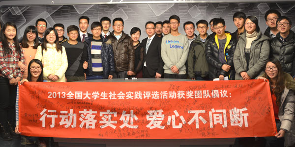 人民網(wǎng)北京1月15日電 (記者 張葳)1月15日,2013全國大學(xué)生社會實踐評選活動舉行頒獎和座談活動,獲獎大學(xué)生代表上百個團(tuán)隊發(fā)表了倡議書,號召全國大學(xué)生們在社會實踐中做到“行動落實處,愛心不間斷”,經(jīng)常性、持續(xù)性地走進(jìn)社會、服務(wù)基層,拒絕形式主義。