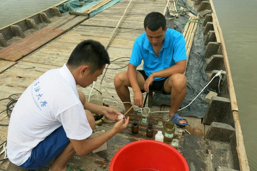 7月10日,團(tuán)隊(duì)聯(lián)合廣西海洋研究所紅樹林研究中心對欽江東西支流進(jìn)行水樣調(diào)查,這是此次活動(dòng)中的重要工作。6名男生在船上和工作人員一同工作了26個(gè)小時(shí),協(xié)助工作人員進(jìn)行水樣采集與固定,流速與流向測定,水深測定及GPS定位等,從中也學(xué)到了很多海洋知識。
