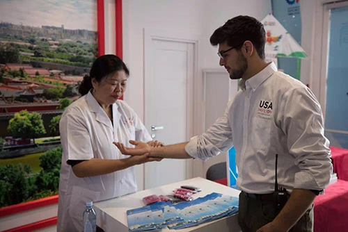 當(dāng)薩仁在中國館尾廳進(jìn)行綠色中醫(yī)針灸展示時(shí),不時(shí)有好奇的游客上來體驗(yàn)。一位在中國館交流的美國館志愿者也想親身體驗(yàn)中醫(yī)針灸。短暫的號(hào)脈后,薩仁說:“這小伙子體格很好,就是手腳會(huì)在冬天發(fā)涼。”說著便幫美國館志愿者進(jìn)行舒解經(jīng)絡(luò)的治療。