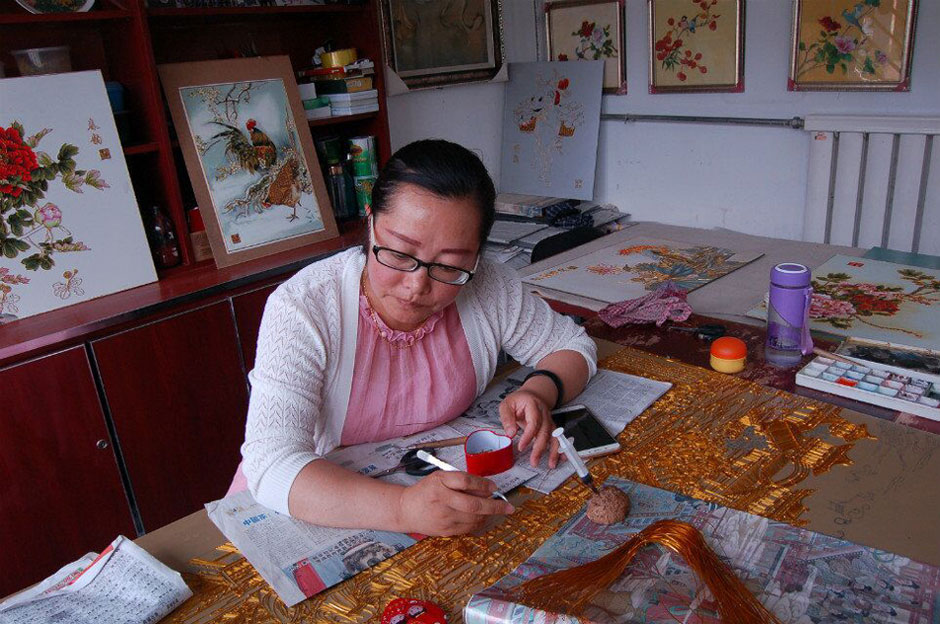 “因為喜歡”,簡簡單單四個字,卻有著震撼人心的力量,蘭州理工大學(xué)“問藝社”的同學(xué)們走進(jìn)古香古色的工作室,見到了掐絲畫藝人高芬平。她曾擁有穩(wěn)定的教師工作,只因?qū)ζz畫的無限喜愛而辭職走上了艱難辛苦的從藝之路。如今的她是一位掐絲畫高級工藝師,正在制作靜寧特色掐絲畫——絲綢之路,巨幅畫作幾乎和她一樣高。在明媚陽光的工作室里,她享受著自己忙碌中的寧靜。