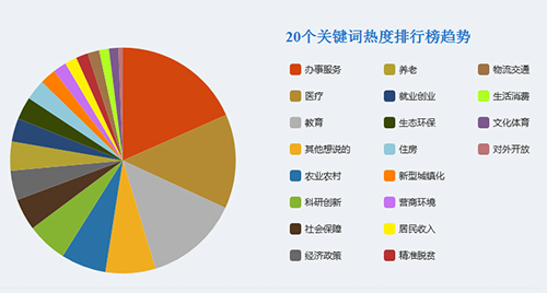 圍繞群眾關(guān)切,本次征集活動共設置了20類話題。辦事服務、醫(yī)療、教育是網(wǎng)友關(guān)注的重點,位居話題榜前三位?蒲袆(chuàng)新、農(nóng)業(yè)農(nóng)村、社會保障、養(yǎng)老、經(jīng)濟政策、生態(tài)環(huán)保、住房分列四到十位。