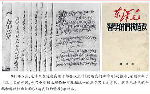 延安整風運動以反對主觀主義、宗派主義、黨八股,樹立馬克思主義作風為主要內容。而鑒于深重的思想之弊和慘痛的實踐教訓,反對主觀主義以整頓學風,成為開展整風運動的關鍵。整風運動開展后,毛澤東就緊緊抓住思想方法和作風問題不放。他在給中央研究組同志的信中指出:學習理論要“以研究思想方法論為主”。破除錯誤的思想方法,暢行正確的思想作風,最重要的就是要遵循實事求是的思想路線,做到理論聯系實際!皩嵤虑笫恰边@個詞,并非毛澤東首創(chuàng),但把“實事求是”上升到黨的思想路線的高度,則是毛澤東的功勞。毛澤東強調,“要分清創(chuàng)造性的馬克思主義和教條式的馬克思主義”,“宣傳創(chuàng)造性的馬克思主義”,“使中國革命豐富的實際馬克思主義化”。不能從理論上來思考中國革命實踐的人,是不能妄稱為馬克思主義理論家的。只有從客觀實際中概括出而又在客觀實際中得到證明的理論,才稱得起我們所講的理論。