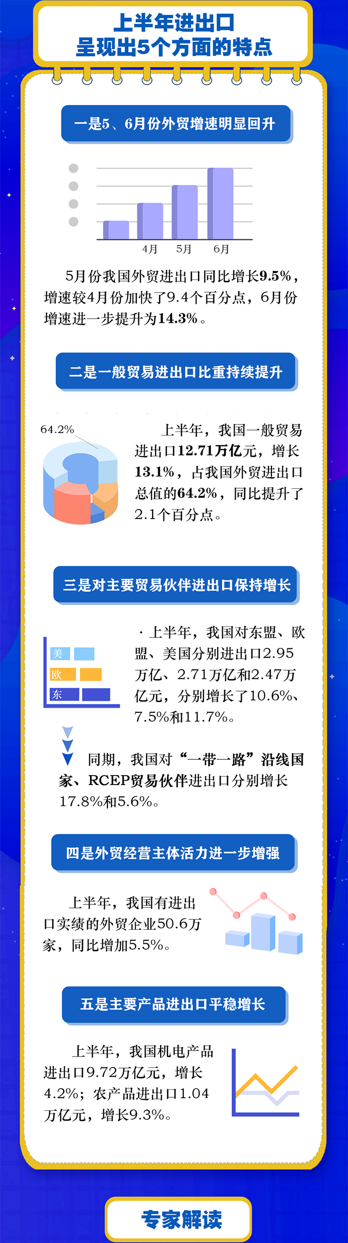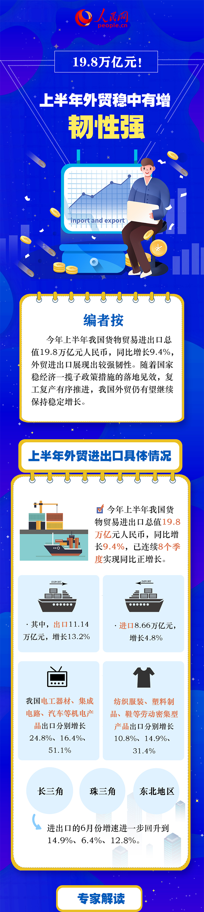 上半年我國外貿進出口展現(xiàn)出較強的韌性,一季度平穩(wěn)開局,5、6月份迅速扭轉了4月份增速下滑的趨勢,為全年外貿保穩(wěn)提質打下了堅實的基礎。據(jù)海關統(tǒng)計,今年上半年我國貨物貿易進出口總值19.8萬億元人民幣,同比增長9.4%。其中,出口11.14萬億元,增長13.2%;進口8.66萬億元,增長4.8%。
