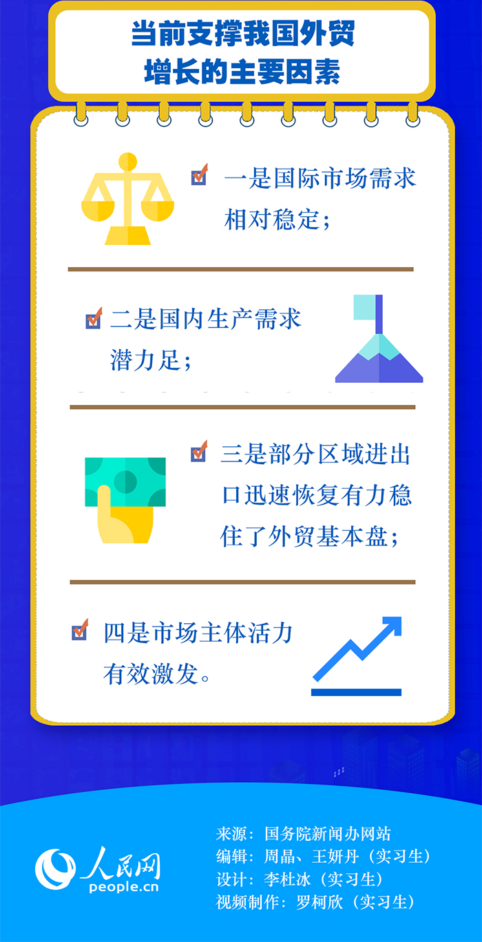 商務部原副部長魏建國在接受人民網“強觀察”欄目記者采訪時表示,上半年的外貿增長主要有三方面原因:首先,高效統(tǒng)籌疫情防控和經濟社會發(fā)展取得實效。其次,多措并舉穩(wěn)市場主體。隨著國家穩(wěn)經濟一攬子政策措施的落地見效,外貿保穩(wěn)提質等各項工作加快推進,我國外貿市場主體活力有效激發(fā)。此外,以國內大循環(huán)為主體、國內國際雙循環(huán)相互促進的新發(fā)展格局的作用正在發(fā)揮出來。