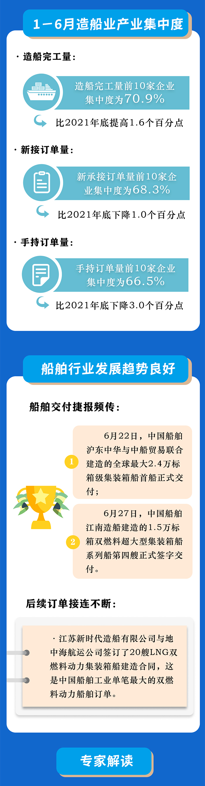 “上半年中國(guó)船舶工業(yè)克服不利影響,主要指標(biāo)繼續(xù)保持世界第一,這是一個(gè)了不起的成績(jī)!敝袊(guó)船舶工業(yè)行業(yè)協(xié)會(huì)秘書(shū)長(zhǎng)李彥慶在接受人民網(wǎng)“強(qiáng)觀察”欄目記者采訪時(shí)表示,上半年我國(guó)船舶工業(yè)呈現(xiàn)出五方面特點(diǎn):一是接單的船型結(jié)構(gòu)不斷優(yōu)化。從以散貨船和油船等傳統(tǒng)船型為主,到現(xiàn)在散貨船、油船、集裝箱船、氣體船、客船以及特種船舶均衡發(fā)展。二是重點(diǎn)船型加速突破,新型裝備不斷涌現(xiàn)。今年上半年,大型LNG運(yùn)輸船成交30艘,創(chuàng)造歷史新記錄;汽車運(yùn)輸船市場(chǎng)份額穩(wěn)居世界第一;海上風(fēng)電安裝船、深遠(yuǎn)海養(yǎng)殖裝備等新型海洋裝備實(shí)現(xiàn)批量接單。三是手持訂單不斷增長(zhǎng),為加快轉(zhuǎn)型升級(jí)奠定堅(jiān)實(shí)基礎(chǔ)。當(dāng)前,國(guó)內(nèi)大部分企業(yè)訂單已能滿足2~3年生產(chǎn)量,基本解決了持續(xù)生產(chǎn)經(jīng)營(yíng)的問(wèn)題。四是產(chǎn)業(yè)結(jié)構(gòu)日趨合理,“專精特新”發(fā)展理念逐步深入。五是跨行業(yè)融合發(fā)展的“產(chǎn)業(yè)生態(tài)體系”逐步建立。
