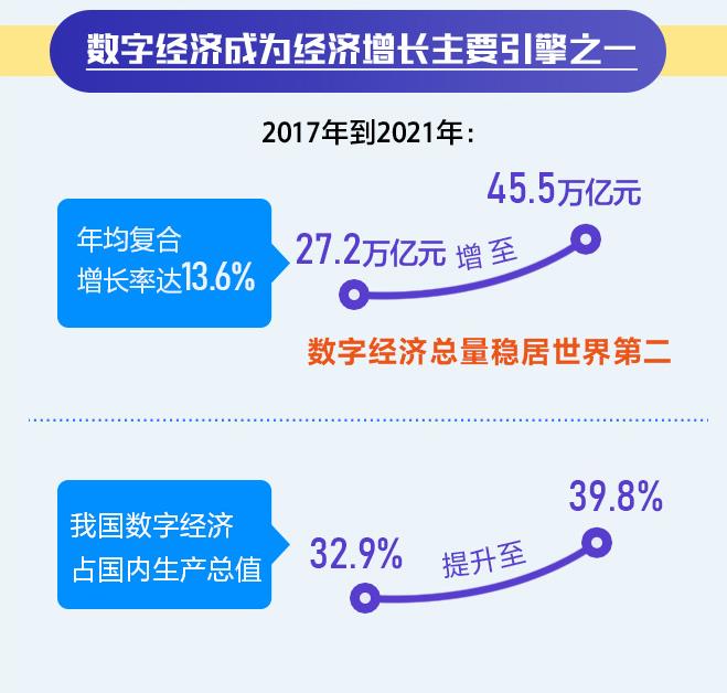 《報(bào)告》顯示,2017年到2021年,我國數(shù)字經(jīng)濟(jì)規(guī)模從27.2萬億增至45.5萬億元,總量穩(wěn)居世界第二,年均復(fù)合增長率達(dá)13.6%,占國內(nèi)生產(chǎn)總值比重從32.9%提升至39.8%,成為推動(dòng)經(jīng)濟(jì)增長的主要引擎之一。